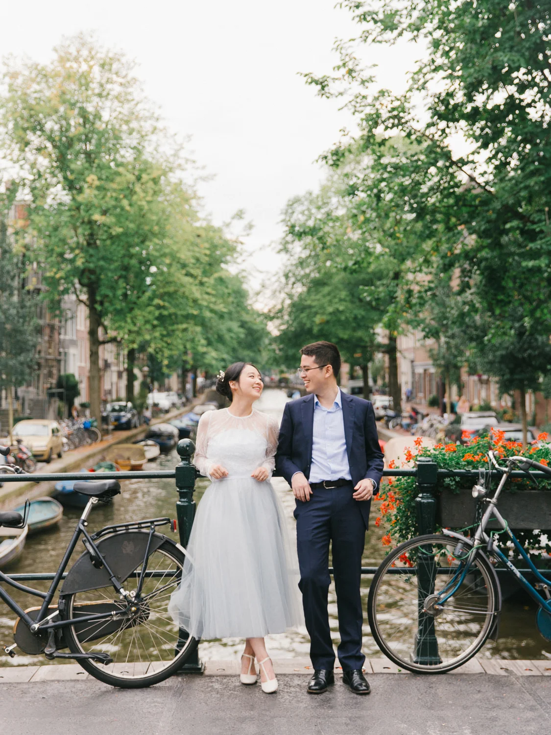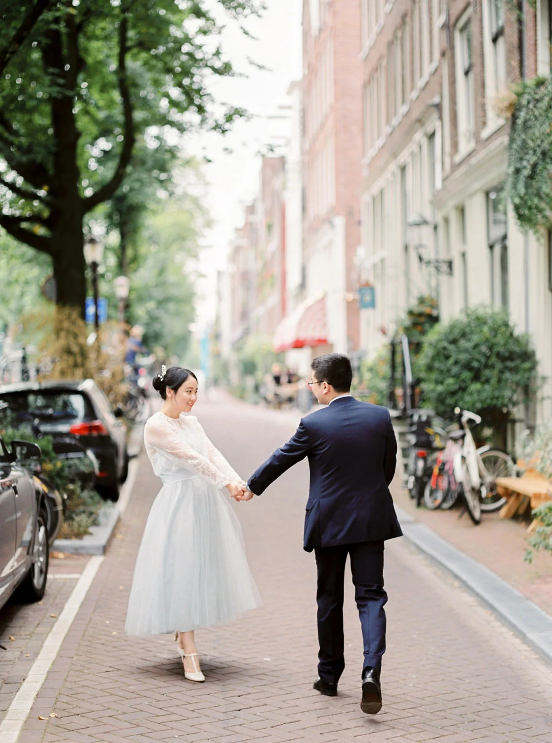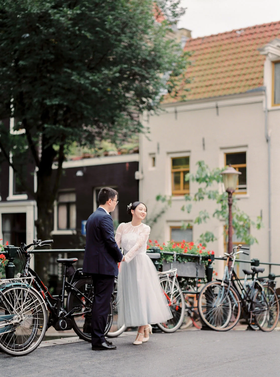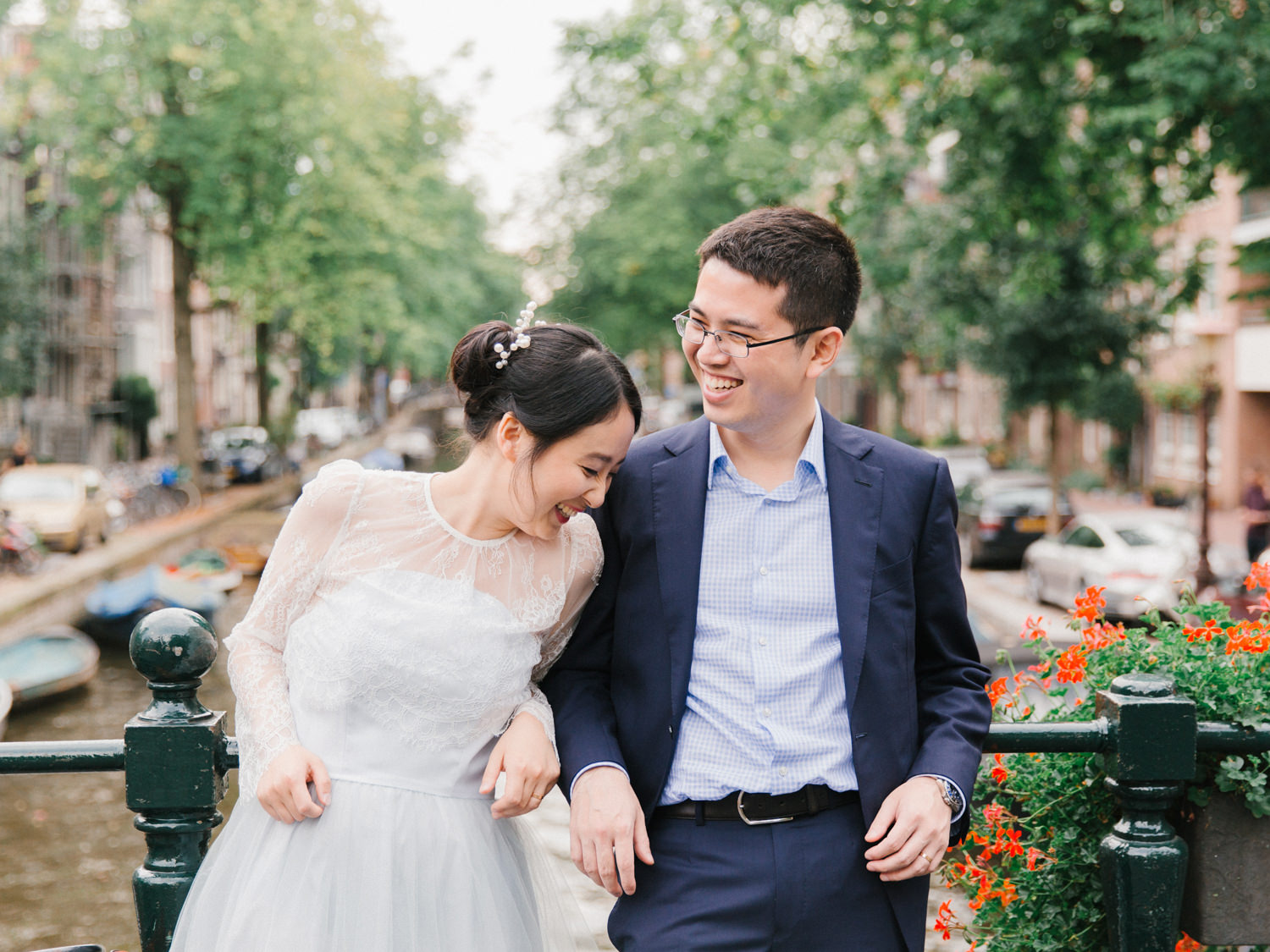 Not to exaggerate, but Amsterdam is one of the most romantic cities in the summer season. Canals are covered with greens and flowers, and those canal houses appear to be more lovely somehow. We shot this engagement session around Prinsengracht and De 9 Straatjes (9 little streets). The birde Mengru chose a Alexandra Grecco tulle dress and lace top for this session - the perfect outfit for an engagement session!