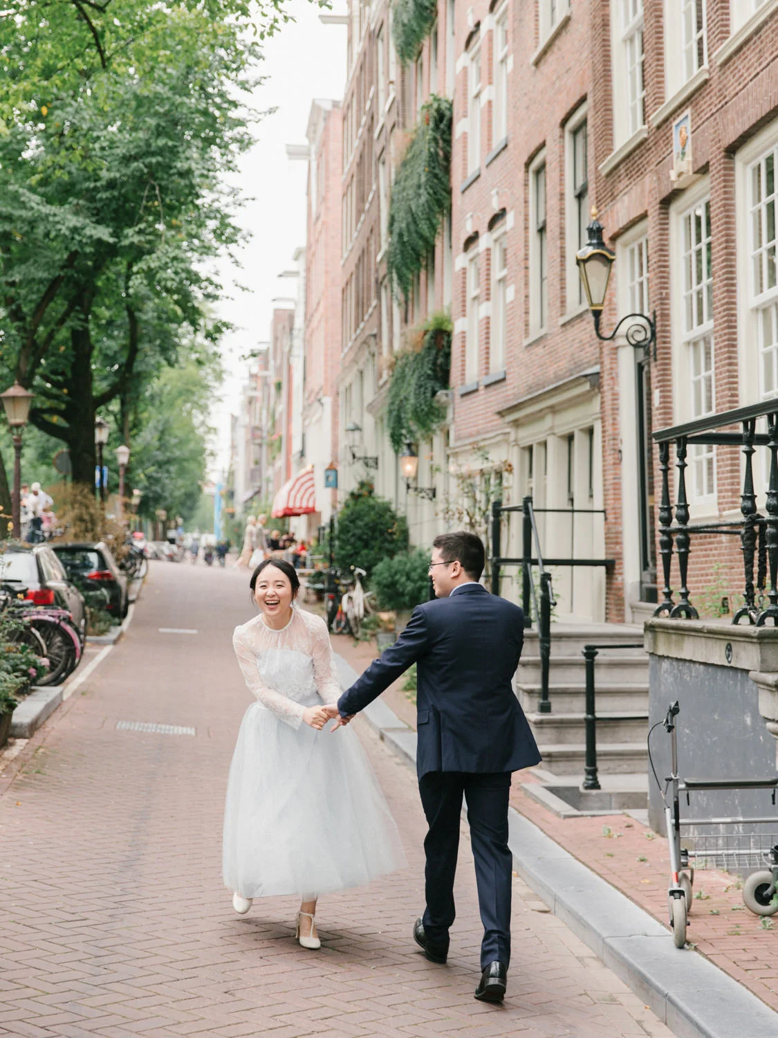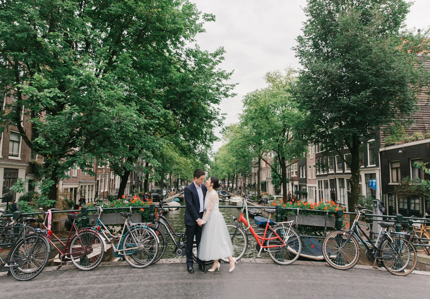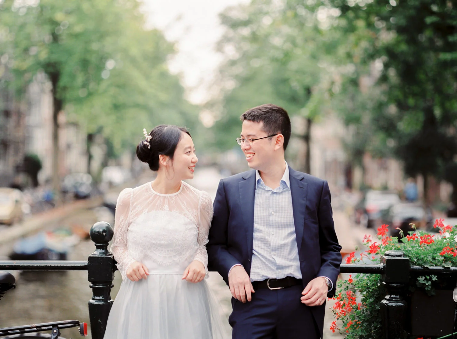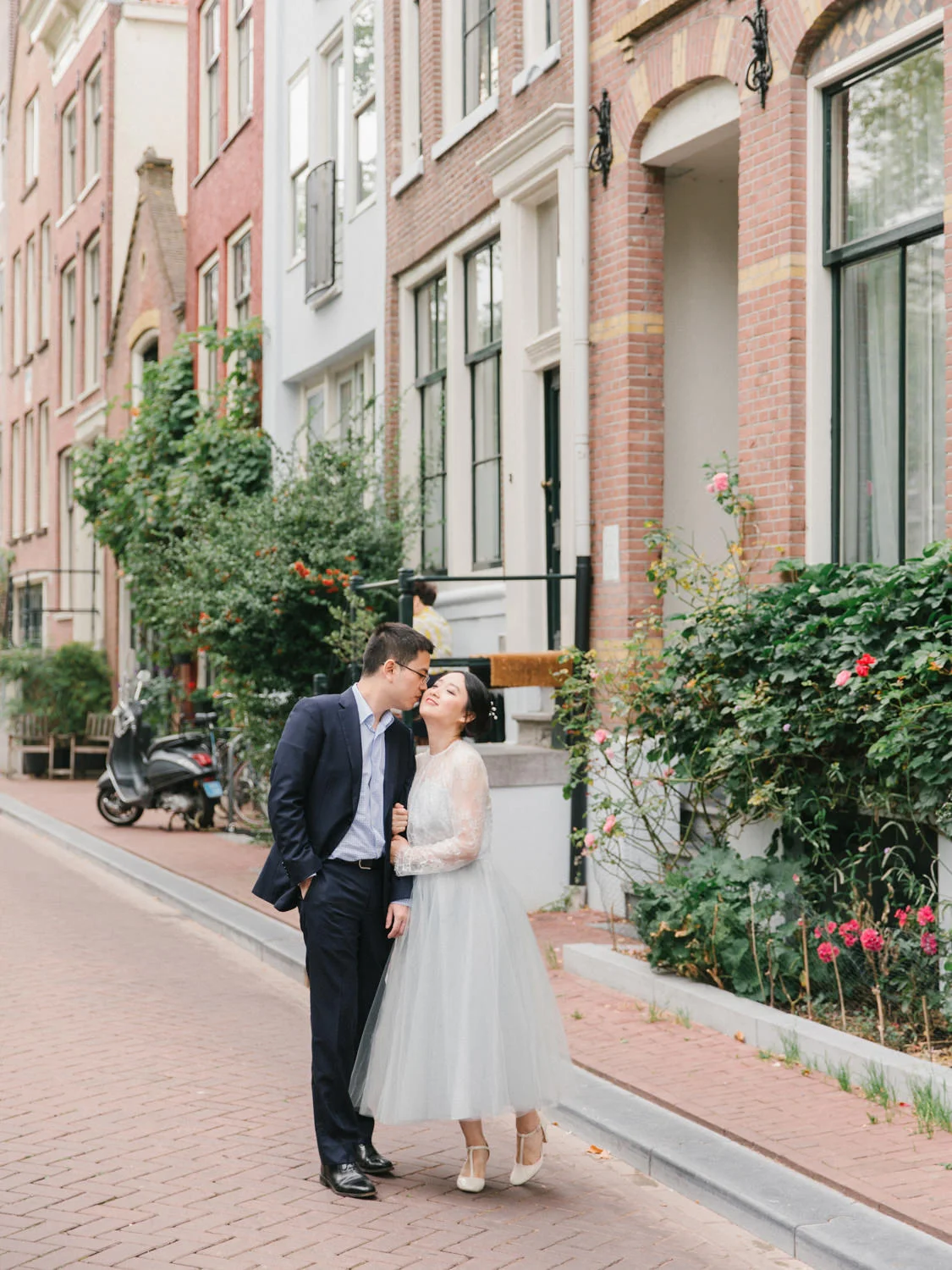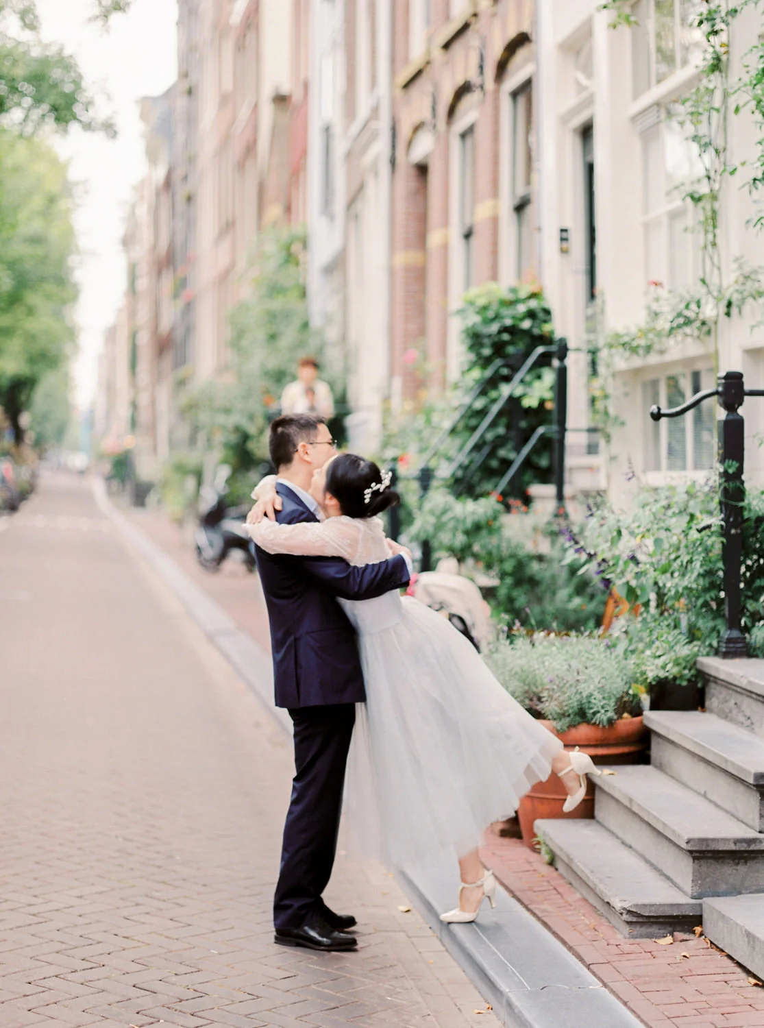 Not to exaggerate, but Amsterdam is one of the most romantic cities in the summer season. Canals are covered with greens and flowers, and those canal houses appear to be more lovely somehow. We shot this engagement session around Prinsengracht and De 9 Straatjes (9 little streets). The birde Mengru chose a Alexandra Grecco tulle dress and lace top for this session - the perfect outfit for an engagement session!